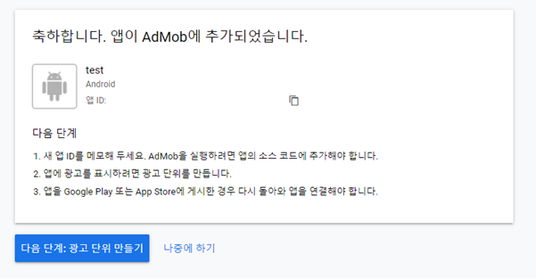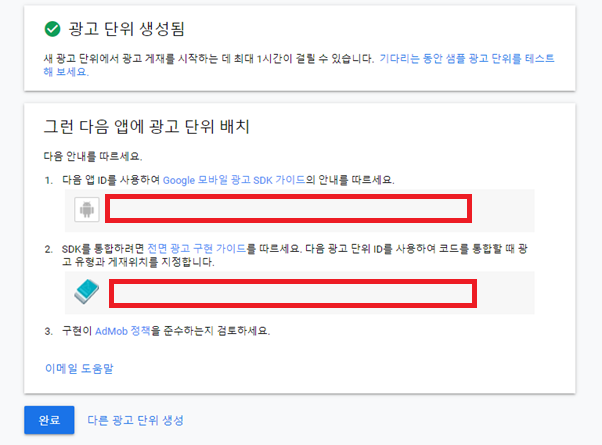 광고 단위 생성이 완료되면 위와 같이 앱 ID와 광고 ID가 나오는데 이것을 이용하여 광고를 삽입한다.