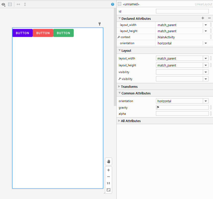 위 사진은 horizontal LinearLayout을 적용하고, 모든 버튼의 layout_width를 wrap_content로 적용했을 때의 모습으로, 버튼들이 수평으로 나란히 배치된 것을 확인할 수 있다.