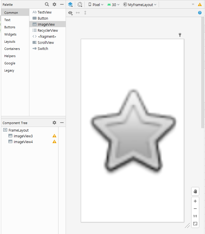 위 사진은 FrameLayout을 적용하고, 노란 별 이미지(imageView3)과 회색 별 이미지(imageView4)를 F자식 View로 넣었을 때, 회색 별 이미지만 보이는 것을 확인할 수 있다.