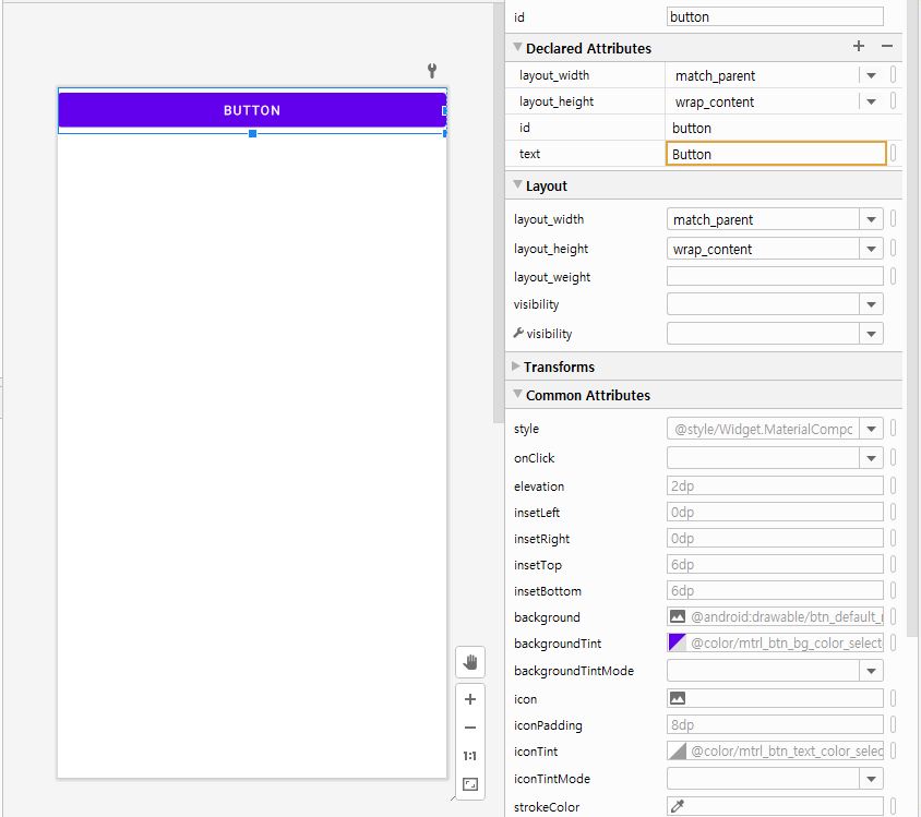 View의 위치를 변경하고 싶거나, View의 text의 위치나 크기를 변경하고 싶은 경우, 해당 View의 Attribute를 통해 해결할 수 있다. layout_width나 layout_heigh를 0dp로 두고, weight(가중치)를 설정하면 비율에 맞춰 너비와 높이를 설정할 수 있다.
